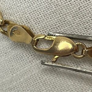 Clasp says “14 k Italy” and “585” which is a marking convention for 58.5% gold which is 14 karat gold. I have not had the chain chemically tested for content. My only knowledge of its composition are the markings on the item.