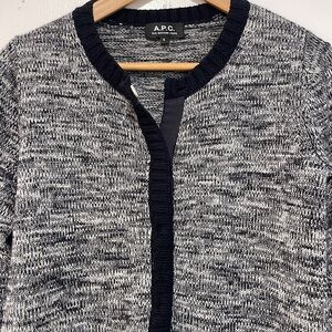 Elegant A.P.C. cardigan with a charcoal and black knit. Perfect for layering. In excellent condition.