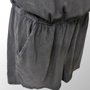 This is a women's black Z SUPPLY short-sleeve romper with pockets, size S. It features a round neckline and short, relaxed sleeves. Very soft feeling. The waist is elasticized, creating a blouson top and a short bottom. The back has a keyhole opening with a single button closure at the neck. The fabric appears to be a soft knit, with a slightly faded look in some lighting. There are some loose threads visible around the buttonhole on the back closure.