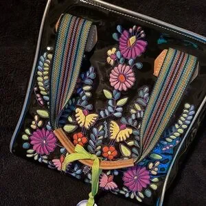 Featuring a bright vibrant floral embroidery with a sleek black background