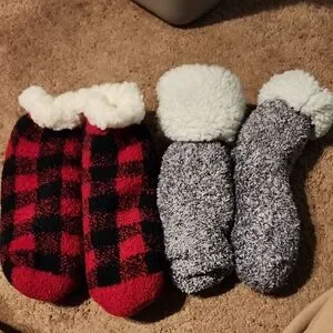 Cozy Muk Luks socks. Red and black plaid design. Soft gray fuzzy pair. Perfect for warmth and comfort.