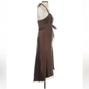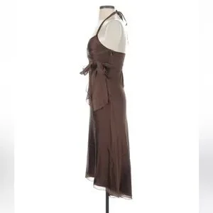 Elegant BCBGMAXAZRIA cocktail dress in 100% silk. Features a halter neckline, sleeveless design, and a flattering wrap silhouette with bow accent at the waist. The rich brown color and lightweight silk fabric make this perfect for weddings, parties, or special events.