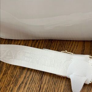 Elegant white women's bag with gold stud accents, perfect for any occasion. Measures 7 1/2 x 5 1/2 white patent leather gold trim and a hardware canvas adjustable strap new with tags on.