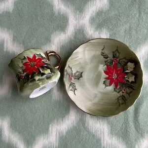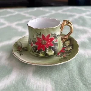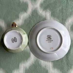 Beautiful delicate bone china cup and saucer, hand painted flower bouquets of different sizes on brushed matte green background and gold rim design. One side has larger flowers and other side smaller. No damage. Marked Lefton china hand painted limited edition 4386. This is a small set. More as decor or espresso.