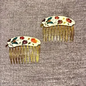 Elegant hair combs with a colorful butterfly & floral design. Features gold, cream, and multicolor accents.
