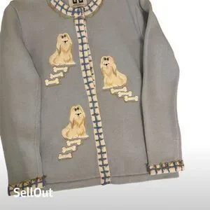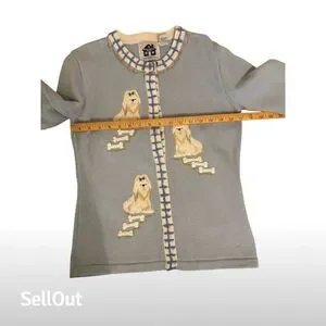 Wrap yourself in nostalgia with this charming Storybook Knits vintage cardigan. In a delightful blue hue, this XS women's cardigan features an enchanting animal print with embroidered dog accents, perfect for dog lovers and vintage enthusiasts alike. The round neckline and long sleeves offer a cozy fit, while the decorative edging adds a touch of whimsy. Ideal for casual outings, cozy gatherings, or a day at the office, this cardigan is a versatile addition to any wardrobe. Pre-owned, with love and care. Excellent preowned condition. One owner.