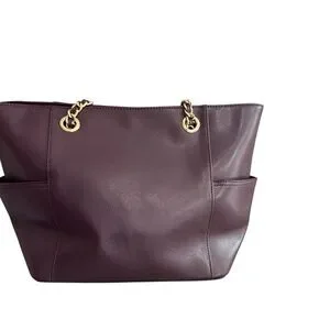 Sophisticated Calvin Klein large tote shoulder bag in deep burgundy. Features sleek design with gold chain handle. Perfect for versatile styling.