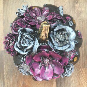 Black pumpkin with metallic gold polka dots and a crown of flowers painted in blue and purple.