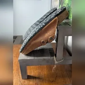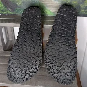 beige two buckles comfortable foot pad lots of padding only worn inside maybe three times leather great perfect condition maybe one little water stain a couple little scratches but that's about it the soles are perfect like I said only worn inside size medium size 12