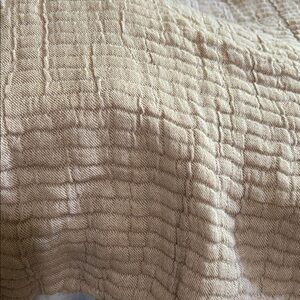 Elegant Casaluna coverlet in a gentle warm brown / beige tone. Reversible design for versatile style. Cozy and inviting. All 3 pieces are new with tags . One sham is missing cardboard packaging tag . Tag on sham . No longer in stores or in production.