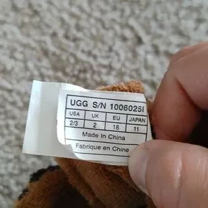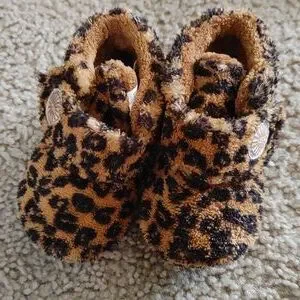 Cozy UGG baby booties. Tan and black design. Perfect for little feet. Size 2/3