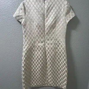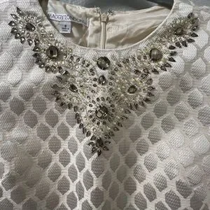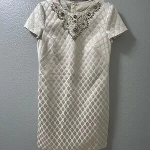 Chic cream mini dress by Maggy London. Features a beautifully embellished neckline. Perfect for elegant occasions. In excellent condition.