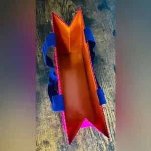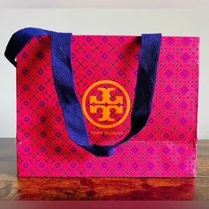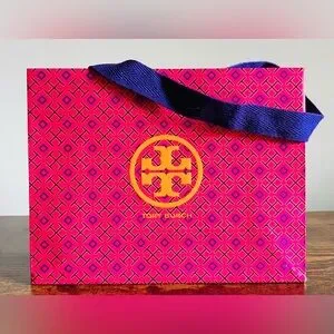 Vibrant Tory Burch gift bag with fuchsia and gold geometric design. Features bold logo and purple handles.
