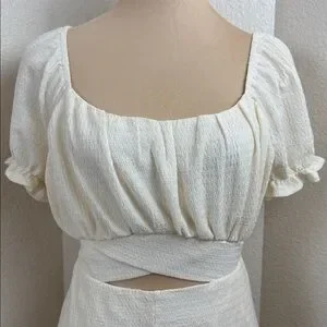 Effortless and chic, this romper is perfect for sunny days or warm evenings out. Made from a soft, lightweight textured fabric, it features a flattering square neckline, puff sleeves, and a stylish crisscross waistband with a peekaboo cutout detail. The high-waisted shorts give a clean, tailored look while keeping things comfortable and breezy.
