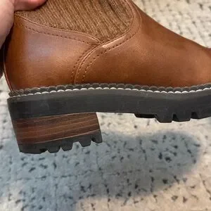 Elegant brown leather ankle boots with a cozy knit cuff. Perfect for fall and winter.