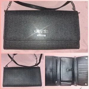 Chic black crossbody bag by GUESS. Features textured design and silver accents. Perfect for everyday use. Detachable straps to use as a wallet
