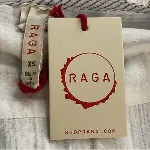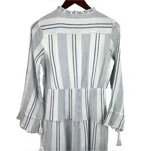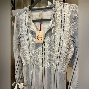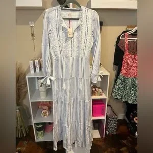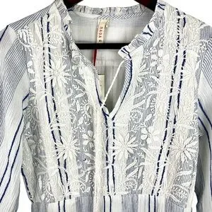 NWT RAGA Fleri White and Blue Striped Floral Embroidered Tie Long Sleeve Dress