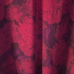 Chic magenta maxi dress with floral pattern. Features elegant sheer sleeves and a stylish slit.