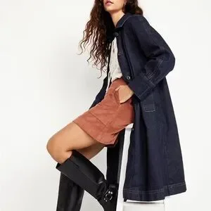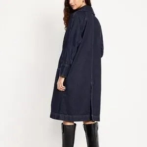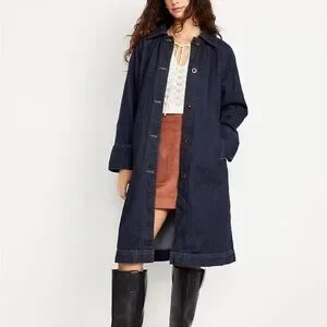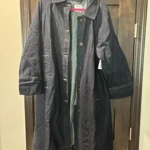 NWT Old Navy Long trench-style denim coat. Stylish dark blue trench coat. Perfect for layering. Offers comfort and sophistication. A very roomy XL.