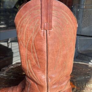 Rugged Unisex Frye cowboy boots in rich cognac leather. Timeless western style with sturdy construction. Well worn in but many, many miles still to go. Women’s 11, Men’s 9.5