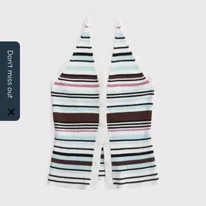 Stylish halter neck top with colorful stripes. Features a button-up front.