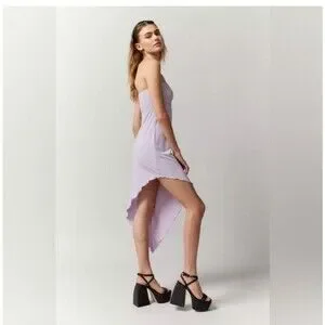 The Urban Outfitters Assymetrical Lavender Strapless Dress in size Small is a stylish and versatile. With a solid lavender color and sleeveless design, this dress is easy to care for with its machine washable fabric. The asymmetric hem adds a unique touch to the dress, making it a trendy choice for the summer and spring seasons. Ideal for women looking for a fashionable and comfortable outfit from a trusted brand like Urban Outfitters.