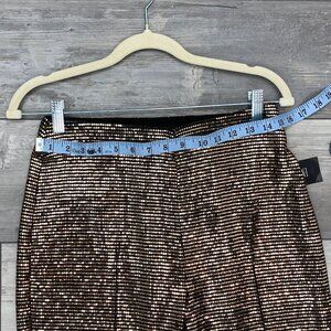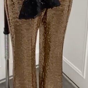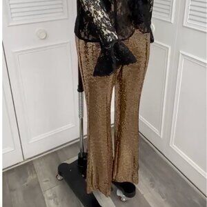 Dance Inc. Gold Bronze on Black Background Sparkle Sequin Pants Sz S-M for Gorgeous Night Out Special Event. These Pants catch every light ray and sparkle with every step you take. Beautiful for Holidays, Dance or Special Events. Hand Wash in Cold or Dry Clean ( I use Dryel that I purchase on Amazon to dry clean at home) These say size small but will fit medium. Shown on mannequin with 29" waist and 39" Hips.