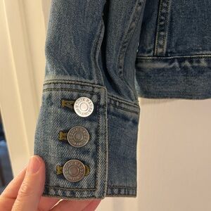 Authentic blue cotton jean jacket. Features a timeless design. Perfect for casual wear.