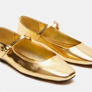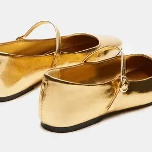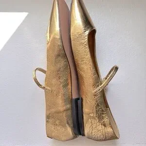These Steve Madden flats look brand new. Shiny gold Mary Jane flats have a sleek design; perfect for adding a touch of elegance, and perfect for upcoming holidays. Leather upper.