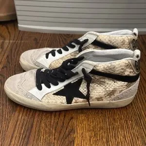 Stylish Golden Goose sneakers. Beige textured upper with black star and laces. Comfortable and trendy. Mid top… beautiful snake skin detail