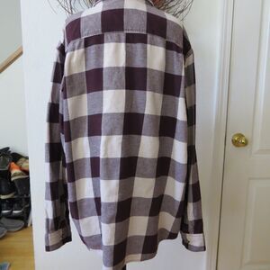 Cozy and comfortable but works hard too! This shirt is cream,burgundy and brown plaid. It has: 2 chest pockets that button, button cuffs, spread collar and is regular fit. 97% cotton 3" spandex, machine wash/dry. Approx measurements laid flat: length 29" sleeves 26" chest (p2p) 27.5". Great for a woman, too!