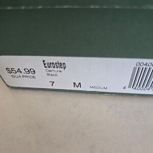 This is a pair of women's black Eurostep "Demure" mules/clogs, size 7M. The shoes feature a leather upper with man-made balance materials and a slip-on design with small decorative bows on the sides. They have a square toe and textured outsoles with spiral and linear patterns. Visible imperfections include a minor white scuff on the left shoe's toe and light wear on the outsoles. The original box label indicates a price of $54.99. Made in China.