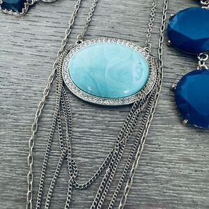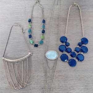 Bundle Lot of 4 gold tone necklaces with blue & teal green jewels and crystal accents. Includes all shown.
