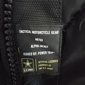 U.S. Army tactical motorcycle gear, alpha jacket issued by Power Trip. Official licensed product of the U.S. Army. Headphone picket along with other numerous pockets. Jacket comes with liner.