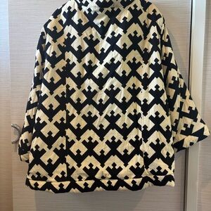 Stylish jacket with a bold black and cream geometric pattern. Perfect for a chic look.