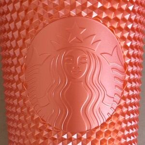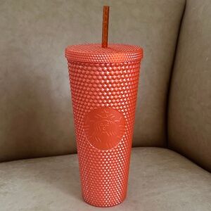 Starbucks Limited Edition 24 oz. Orange Pearl Studded Tumbler - Fall/Halloween - NWOT. Add some spice into your life with this Fall/Halloween 2022 limited edition Venti-sized (24 oz.) Starbucks tumbler. Features a distinctive studded, pearlized texture, BPA-free plastic material, screw-on lid with matching straw, and iconic Starbucks logo on the front. Designed for cold beverages like iced coffee or tea. Excellent condition - never used - NWOT!