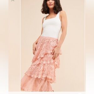 FARM Rio Peach eyelet Tiered Midi A-Line Skirt asymmetric hem sz L side zip