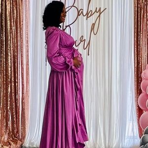 This dress is so amazing! Wore it once for 3hrs for my baby shower (the skirt is very flowy and the cutouts allowed for the belly space!), then dramatically lost all my baby weight and boobs! Beautiful color and lays amazingly well- it’s a hard dress to photograph without a model form, but it has since been professionally cleaned and I didn’t want to take any chances. Lovely long sleeves and almost ribbon like detail on the front of the skirt providing room for a sexy split to show leg. Really wish I could still fit it and hard to let go, but my loss is your gain!