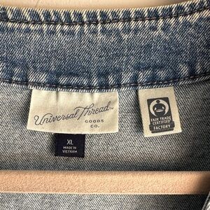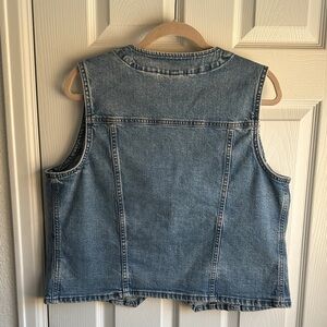 Stylish denim vest with button-up front. Features two front pockets. Very good condition - worn once. Fits TTS. Measures about 22 inches in length; about 21 inches across chest laying flat. See photos for material + care instructions.