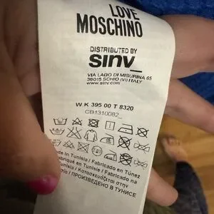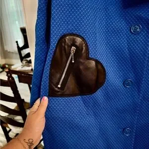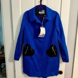 Chic Love Moschino jacket in vibrant blue. Features unique black heart-shaped pockets with zippers.