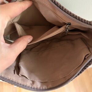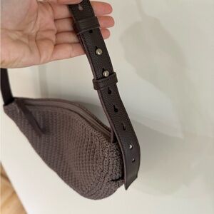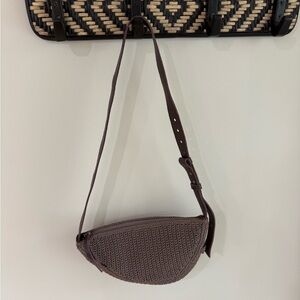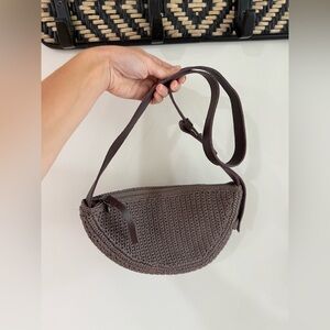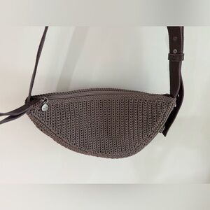 Really pretty crocheted sling cross body bag by the Sak! The bag is a crocheted material and the strap is brown leather. Perfect brown tones for fall.