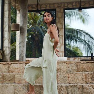 A lightweight, cotton gauze jumper from Gillia. Button down front, spaghetti straps and 2 front pockets. Slightly sheet. Dusty mint color. Relaxed fit. 100% cotton gauze. Brand new, unworn, with tags. Original retail $158.