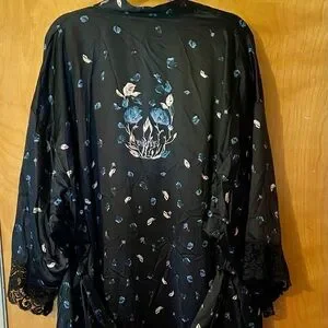 Chic black robe with blue floral accents. Soft and stylish for relaxing moments.