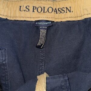 Comfortable navy shorts with tan waistband. Features brand logo. Elastic doesn’t shrink much so true 2XL.