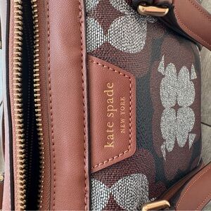 Chic Kate Spade satchel with floral spade pattern. Brown and black design. Ideal for stylish outings.
