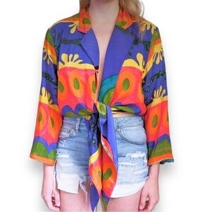 Dorothy Schoelen Platinum Psychedelic Tie Front Long Sleeve Blouse 80s VTG Small