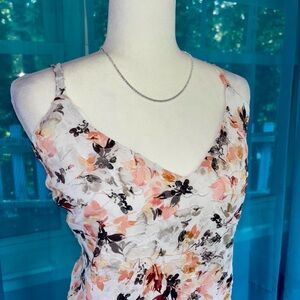 Feminine floral cami top with adjustable straps and a soft polyester lining. Features blush, peach, and black florals on a white background. Lightweight and versatile — perfect for layering under cardigans, jackets, or wearing solo.