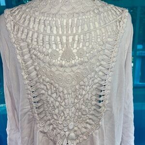Effortlessly chic and boho-inspired, this Torrid top features lightweight rayon fabric with a stunning crochet lace back panel. The open front design makes it perfect for layering over tanks, camis, or dresses.