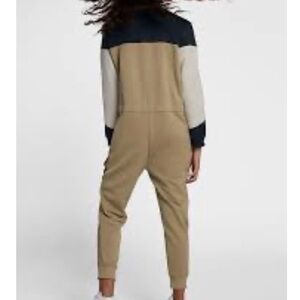 Stylish Nike jumpsuit with a black and tan color scheme featuring a front zip-up design, blade collar and adjustable waistband. Also includes Nike Air branding in bright font, tapered legs with cuffs and side pockets. Ideal for casual wear.