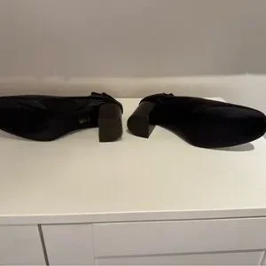 Chic black leather heels with a sleek design. Ideal for versatile wear. Actual size is 8 but fits tts 7.5. EUC. Maybe worn twice